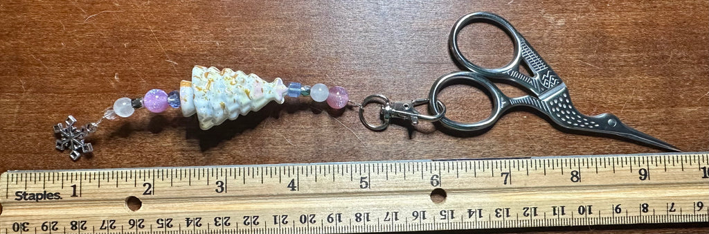 Scissor fob or zipper pull. Festive Fob White vintage Christmas tree bead. Hand made fobs colors may vary.